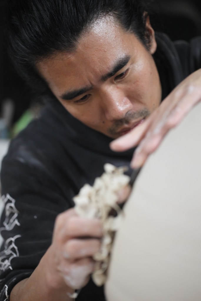 “In my work, I start with the beauty created by Korean artists in the past. In pottery, I focus on the inlay techniques of celadon porcelain, the decorative techniques of Bhuncheong porcelain, and the shapes of the white porcelain. In addition, I want to express the the beauty from the curves and decorative techniques found in hanok (traditional Korean houses) and other types of artisanal tools and objects in the past. I would like to to introduce various Korean traditional artisanal beauty through my ceramics”.